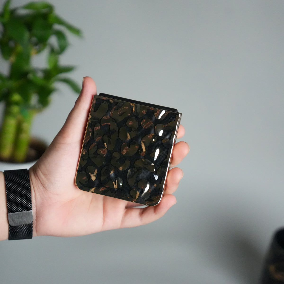 Turn heads with this bold and stylish Galaxy Z Flip 7 case, featuring a transparent leopard-print back paired with a shiny gold chrome frame. The case offers a perfect mix of fashion and protection, enhancing your phone’s look while keeping it safe from everyday bumps and scratches.